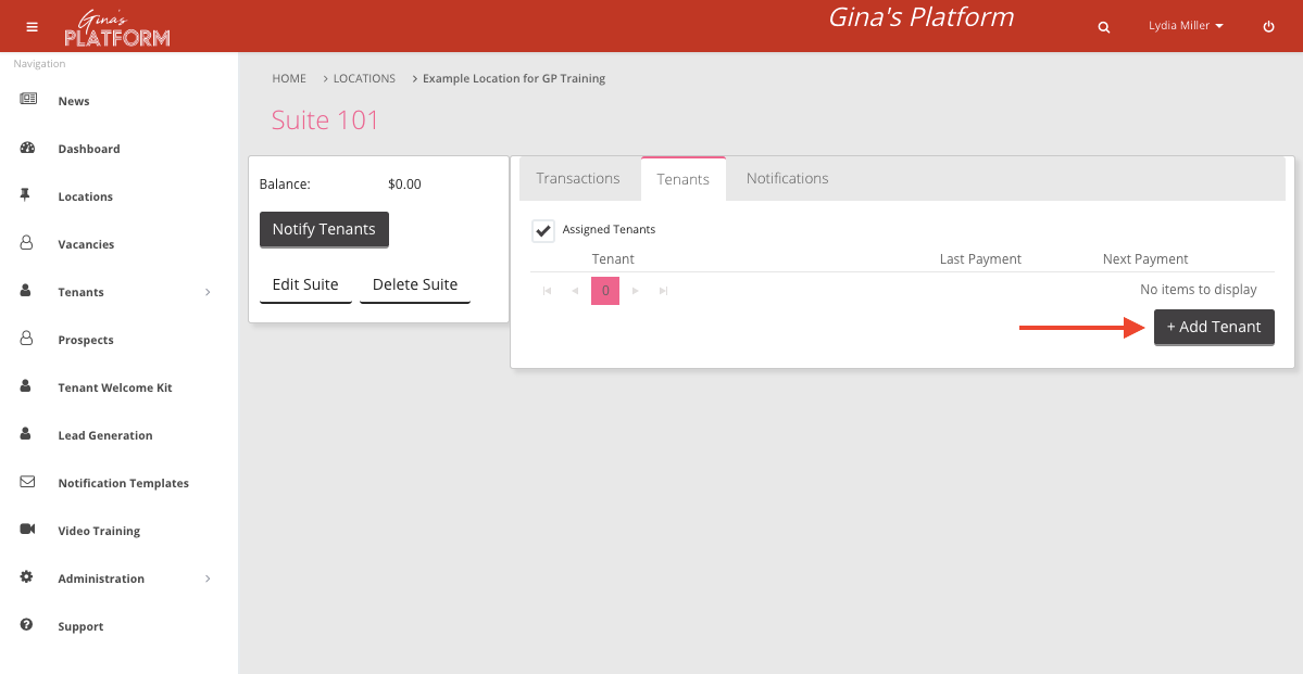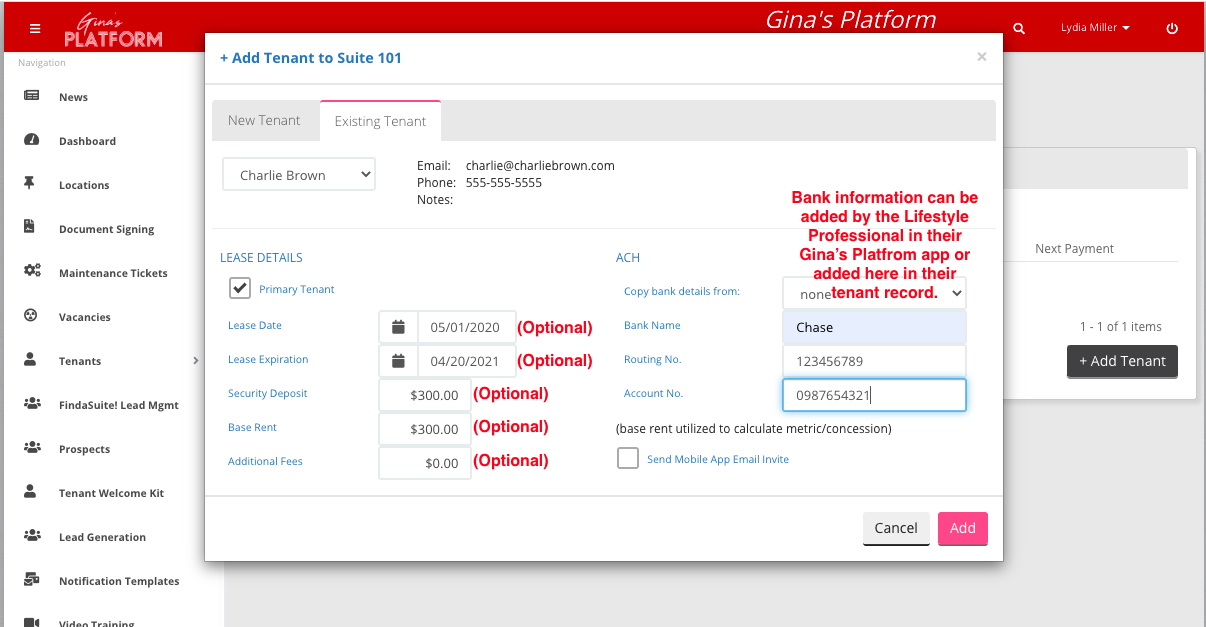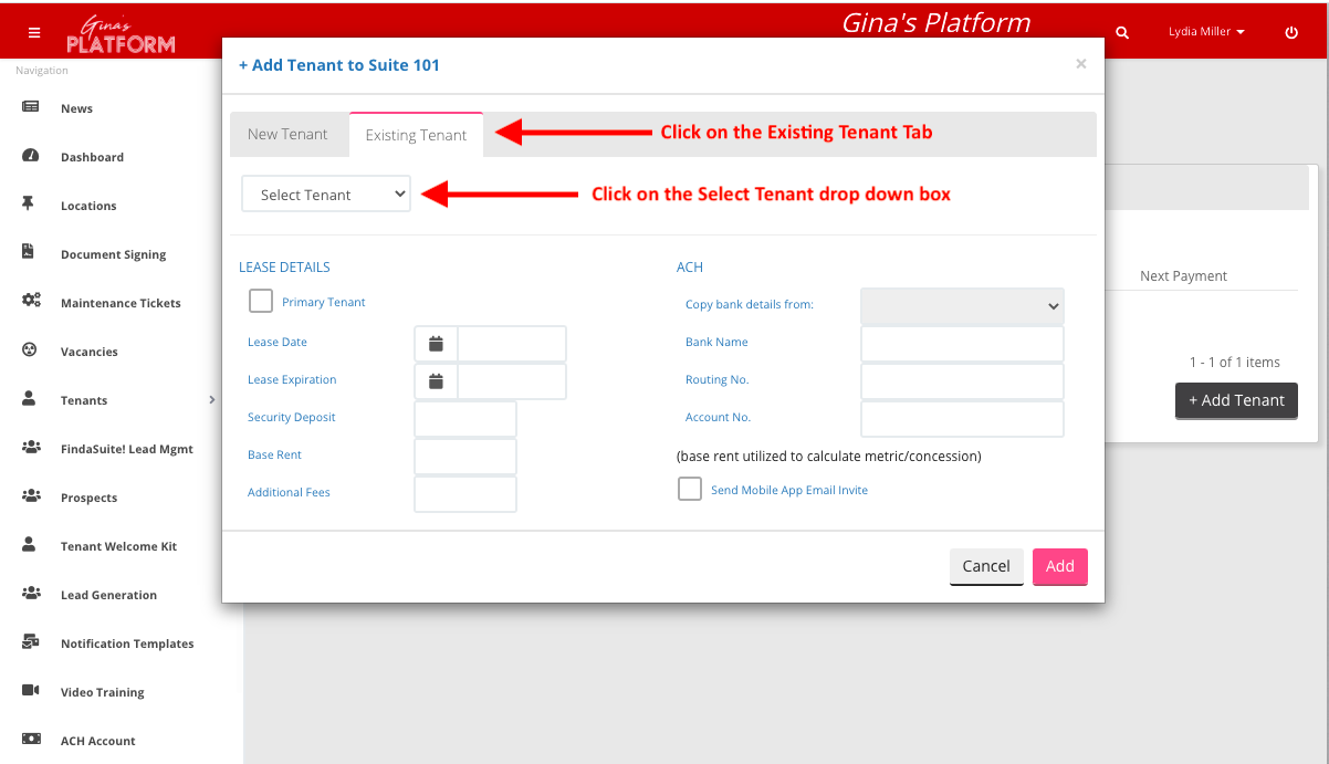 - Click on the Existing Tenant Tab and the click on the Select Tenant drop down box.